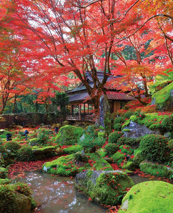 書院から望む「十牛之庭」は、赤や黄に色づいたカエデと一面の杉苔が鮮やかに庭園を彩る。