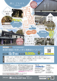 | 1 | 新潟駅(13:00)=高野酒造(蔵人の案内で酒蔵見学と3 種のお酒の試飲付き♪ショップでのお買い物も)=たからやま醸造(老舗酒蔵で案内付きの見学。6 種類の試飲とお猪口のお土産付き♪)=高島屋(16:10)=新潟駅(17:00) |