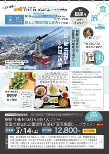 | 1 | 銀座・新潟情報館 THE NIIGATA(7:00)=上田の郷(南魚沼産コシヒカリと山菜・地場野菜を使った郷土料理の昼食。ぬか釜炊きの様子も見学!)=道の駅南魚沼(南魚沼産コシヒカリや名産品のお買い物)=体験工房 大源太(新潟を代表する名産品「笹団子」作り体験)=湯沢高原ロープウェイ(眼下に広がる雄大な冬景色を眺めながら空中散歩)=銀座・新潟情報館 THE NIIGATA(20:00) |