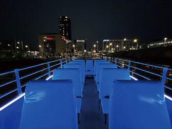 [特徴] 2階座席数 キャビン部分28 席+補助席最大5 席・デッキ部分21 席( 防水) +補助席最大4 席・キャビン内空調完備・キャビン最前列全面ガラス張り・ビニールポンチョ車内販売
