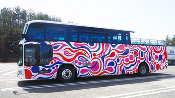 見晴らしの良いデッキと空調完備キャビン付きのラッピングバス