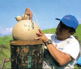 花火の打上は、金属製(ステンレスが主流)の筒で行うのが一般的です。筒の底には、打ち上げ用の「発射火薬」が仕込まれて、点火と同時に膨張で球が上空に向かって飛び出していきます。