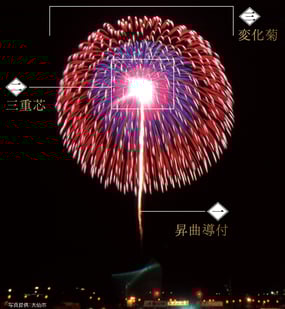 同心円状に開く花火の親星の内側に一つの芯がある花火を「芯入」と呼び、日本の花火の基本形です。更に内側に芯を持たせたのが「八重芯」、芯が更に増える毎に「三重芯」「四重芯」となり、現在は「五重芯」が尺玉の最高かつ限界と言われています。「色の境目の数=芯の数」と覚えると解りやすいでしょう。芯に特に明るいダリヤ星を用いた「輝光芯」などもあります。