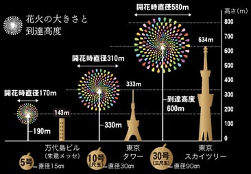 到達する高度と大きさは、尺玉が東京タワーとほぼ同じ300m、三尺玉ならスカイツリーとほぼ同じ600mと覚えておくとイメージしやすいですよ。