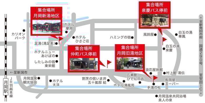 月岡温泉 ■泉慶バス停前・「源泉の杜」手湯前(9:35発) ■仲町バス停前・「月姫広場」足湯前(9:40発) |