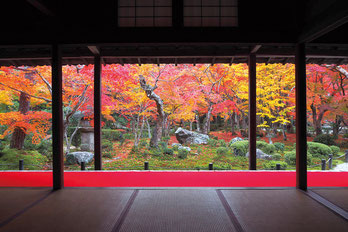 書院から望む「十牛之庭」は、赤や黄に色づいたカエデと一面の杉苔が鮮やかに庭園を彩る。