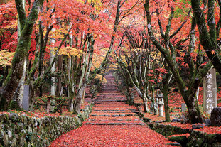参道の石段に舞い落ちる絨毯のようなモミジと苔むした石垣の対比が美しい