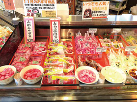 豊富な種類の漬物と試食が並びます