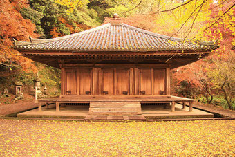 六郷満山の総寺院。真っ赤なモミジやイチョウが護摩堂を取り囲むように色づく。